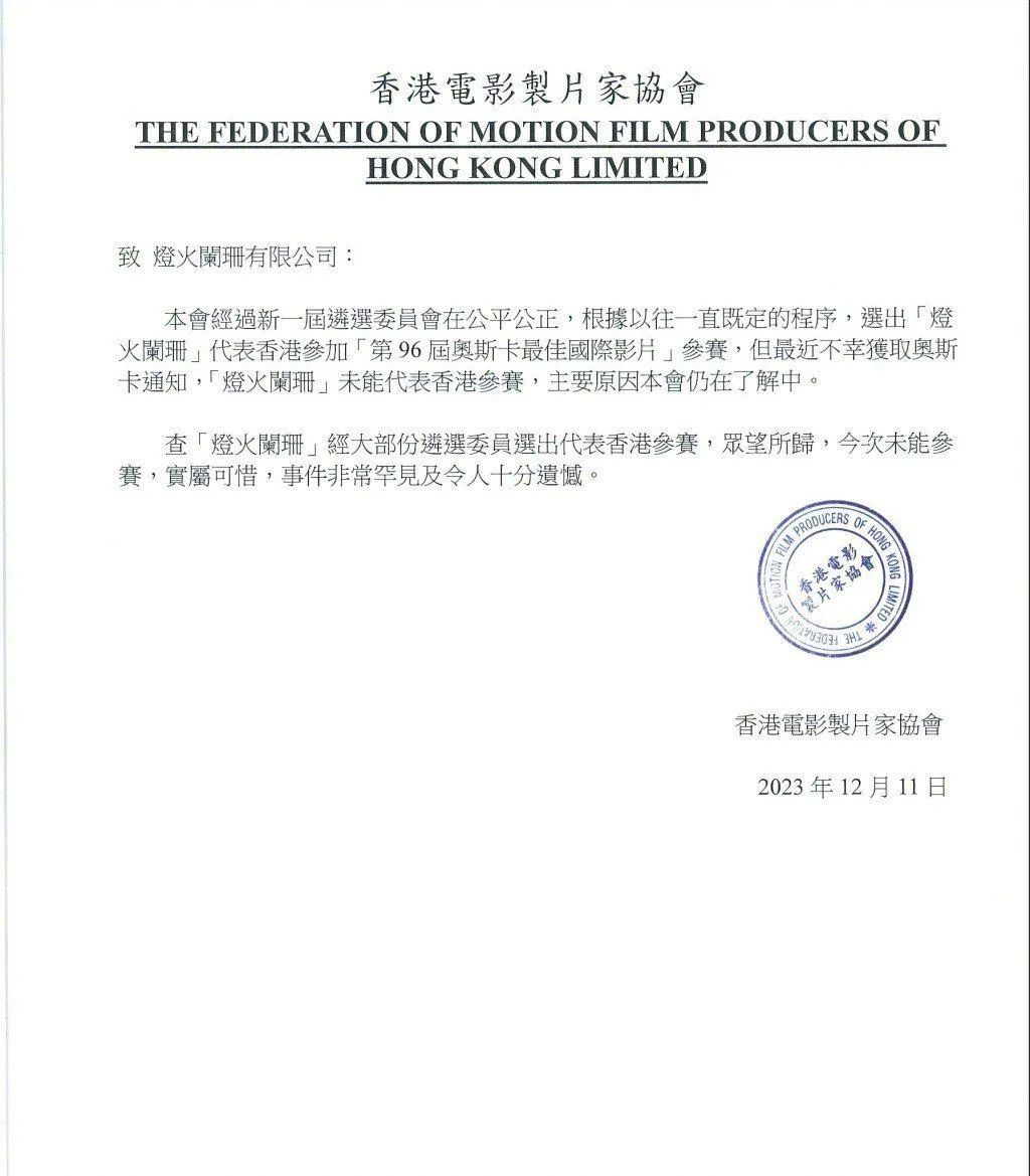 北京时分12月13日排列三色碟,据媒体报说念,由张艾嘉、任达华主演,代表中国香港竞逐第96届奥斯卡最好外洋影片的《灯火衰败》忽然被陈说取消参选资历。原因是算作奥斯卡学院成员之一的任达华,在投票要领时投了本片一票,但因他同期是本片男主角,凭证奥斯卡评比本年8月修改的最新限定,本片涉利益突破,故遭奥斯卡革职,无法角逐“最好外洋影片奖”。